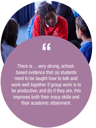 Howe and Mercer (2) reviewed the research available at the time on how children’s collaborative talk contributes to learning and concluded that group work can really help learning and the development of understanding – but that “For collaborative activity to be useful, teachers need to help children develop the necessary communicative skills for engaging intellectually with each other.” They also need to be offered suitable activities, with tasks generally designed to encourage cooperation rather than competitiveness. Some children may need more guidance than others on how to engage productively in classroom dialogue, and classroom culture matters. But developing the oracy skills for productive group work benefits all students.